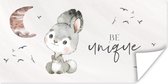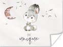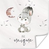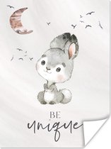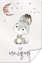 Complétez la pépinière avec une affiche de PosterMonkey ! L'affiche contient la citation : Soyez unique complétée par un croissant de lune et un lapin. Cette conception convient aux enfants!
