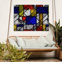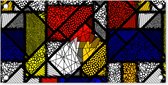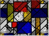 Cette œuvre montre une version en vitrail dans le style de Piet Mondriaan.