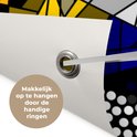 Les Posters de jardin, également appelées toiles de jardin, sont des affiches spécialement conçues pour être accrochées à l'extérieur. Cette nappe de jardin peut donc prendre une raclée. La voile Bisonyl a été utilisée pour cette affiche extérieure. Cette voile est une bâche enduite avec une belle finition. L'affiche de jardin est résistante aux UV, elle ne se décolore donc pas au soleil. Plusieurs anneaux ont été placés dans la toile pour que vous puissiez facilement l'accrocher! Jusqu'à une taille de 120x80 cm, les anneaux sont dans les coins, avec des tailles plus grandes, les anneaux viennent tous les 60 cm. Le tissu résiste aux différentes influences climatiques et est garanti 3 ans.