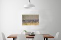 Vue d'un groupe de zèbres chassés. Derrière les zèbres, on peut voir un groupe d'animaux sauvages qui chassent les zèbres. Cette image convient au salon.