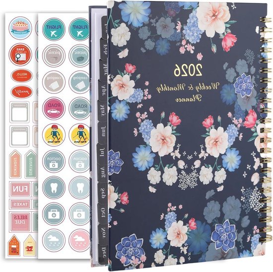 Agenda scolaire 2026 – Calendrier hebdomadaire A5 (de janvier à décembre), Blauw et Zwart, reliure spirale, Hardcover avec élastique, 155 Autocollants inclus, organisation claire, aide pratique à l'étude, agenda et planificateur idéaux.