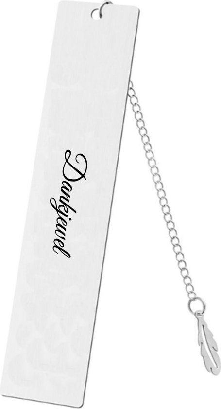 Ce marque-page de remerciement est spécialement conçu pour un cadeau de remerciement et a le thème du remerciement. Le signet a un pendentif sur la chaîne en forme de plume. Le marque-page a une forme rectangulaire avec des coins arrondis et mesure 13 cm de long sur 2 cm de large. Le marque-page est livré dans son emballage d'origine.