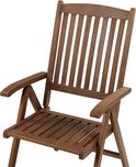 Chaises de jardin pliables avec coussins et dossier réglable. Ajoutez ces chaises à votre jardin pour lui donner une atmosphère classique et rustique et offrir à vous ou à vos visiteurs un espace de siège supplémentaire et confortable. Les chaises sont fabriquées en bois d'acacia durable et se caractérisent par leur résistance aux UV et leurs faibles coûts d'entretien - même sans nettoyage quotidien, le produit peut durer des années. Les chaises ont également un dossier réglable et peuvent être pliées pour gagner de la place hors saison ou lorsque les chaises ne sont pas nécessaires. De plus, ils sont tous deux accompagnés de coussins confortables dans une couleur tendance, qui rehausseront encore davantage l'apparence de votre jardin ou de votre balcon. Détails : Type de produit : Chaise de jardin Style : Rustique Couleur : couleur bois foncé Type de matériau : Bois Massief Matériau principal : Bois d'acacia Overig matériau : Acier Matériau des pieds : bois Massief Matériau du siège : Bois Massief Composition du matériau : 100 % polyester Pièces réglables : Dossier Accoudoir : Oui Finition : Huilé Pliable : Oui Empilable : Non Dimensions : Hauteur des accoudoirs : 67 cm Profondeur : 69 cm Hauteur d'assise : 44 cm Largeur : 54 cm Hauteur : 105 cm Surface d'assise : 48x43 cm Poids: 10 kg Capacité de charge : 160 kg L'offre comprend : 6 x chaise, 6 x coussin Caractéristiques principales : Cordes pratiques pour une fixation facile au siège, Design intemporel, Convient à de nombreux styles d'intérieur, Aspect moderne et qualité depuis de nombreuses années, Classe de résistance aux UV 5 (ISO 105-B02), Pliable peu encombrant, Matériaux naturels Informations sur l'assemblage : Geen assemblage requis Informations Extra : Le bois est un produit naturel. Les différences de couleur et de structure, les grains, les nœuds, les fissures et autres caractéristiques naturelles sont des preuves d'authenticité et non des défauts donnant droit à un remplacement.Pour ce produit, nous proposons un carnet d'entretien détaillé afin de garantir que le meuble reste en bon état le plus longtemps possible pour voir. Consultez les instructions d'entretien et les conseils pour prendre soin de votre nouveau produit - vous les trouverez dans le manuel d'installation du produit sur notre site Web. Résistance du texte : Légèrement déperlant, vous pouvez facilement les utiliser à l'extérieur et les garder à l'extérieur malgré la pluie et l'humidité. S'il n'est pas possible de le mettre à l'intérieur lorsqu'il n'est pas utilisé, nous vous recommandons d'utiliser une housse. Une exposition prolongée des meubles et des accessoires à l'humidité peut causer des dommages. Résistance: Résistant aux taches Conseils d'entretien: bois d'acacia : 1. Les meubles huilés devront être réhuilés avant utilisation et après la saison avant stockage, en particulier dans les climats humides 2.Nettoyez avec un détergent doux et un chiffon doux en respectant le grain du bois. Droog immédiatement après le nettoyage 3.Utilisez une housse de protection hors saison et sous la pluie ou, si possible, placez le meuble dans un endroit frais et sec. Polyester: 1. Nettoyer avec un shampooing sec et une éponge humide ou un détergent doux 2. Lorsqu'il n'est pas utilisé, assurez-vous de stocker le produit dans un endroit propre et sec 3.Les surfaces peuvent être aspirées avec un accessoire approprié.