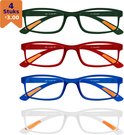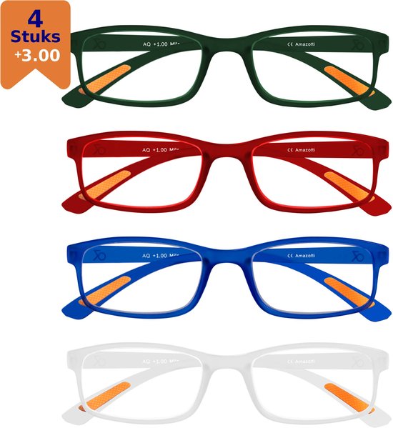 Amazotti Lunettes de lecture Milano Force +3,00 - Set de 4 - Trendy Vert, Rouge, Blauw, Transparent - Lunettes de Lecture Femme et Homme