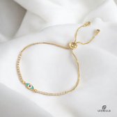 Joli bracelet en or avec une breloque mauvais œil. Vous pouvez faire glisser le bracelet à la taille souhaitée grâce à un bouton coulissant.