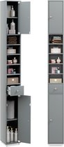 Les deux couches inférieures sont des paniers fermés très élégants. Chaque panier possède un compartiment de rangement avec de hauts bords surélevés. Les deux couches supérieures sont ouvertes et offrent de l'espace pour divers ustensiles de cuisine ou de salle de bain. Sur le dessus de l'armoire, il y a également une possibilité de stockage, grâce aux bords surélevés.