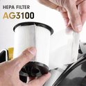 HEPA signifie High Efficiency Particulate Air(filtre à haute efficacité pour les particules de l'air). Meilleure efficacité dans le filtrage des poussières fines. L'AG3100 dispose d'un filtre HEPA et convient donc aux personnes allergiques . IlLe filtre HEPA élimine 99,95 % des particules de poussière et des allergènes de l’air soufflé par l’aspirateur. Les Filtres pour l'AG3100 sont également disponibles séparément via Bol.com.