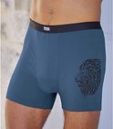 Cet ensemble de 3 boxers confortables en coton stretch doux (environ 145 g/m²) présente un imprimé lion original sur le côté gauche. Pour un confort maximal, le boxer est doté d'une ceinture élastiquée contrastée et d'un insert d'entrejambe doublé pour un bon maintien sans pincement. Fini avec des coutures doubles. 98% coton, 2% élasthanne. Lavable en machine à 30°C. Couleurs : bleu, kaki et gris
