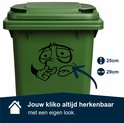 L'autocollant n'est pas seulement amusant, mais aussi très pratique : résistant aux intempéries, facile à appliquer et vous pouvez immédiatement voir quelle poubelle est la vôtre. Geen de soucis le jour de la collecte !