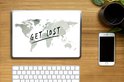 Carte du monde grise avec la citation « Get Lost ». Le texte est sur une carte réalisée à l'aquarelle.