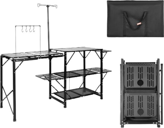 - **Utilisation polyvalente** : Avec un plateau spacieux et des compartiments de rangement pratiques, cette table de cuisine de camping est parfaite pour préparer des aliments, placer des appareils de cuisson et stocker des fournitures.