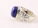 Bague en argent faite à la main et joliment ajourée avec une belle pierre lapis lazuli taille cabochon. La teneur en argent est de 925. La bague est disponible en tour de doigt 16,5.