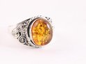 Bague en argent faite à la main et finement travaillée avec une belle pierre d'ambre taillée en cabochon. La teneur en argent est de 925. La bague est disponible en taille 16.