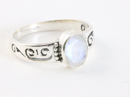 Bague en argent fin brillant faite à la main et joliment ajourée avec une belle pierre de lune arc-en-ciel colorée à facettes. La teneur en argent est de 925. La bague est disponible en taille de bague 19,5.
