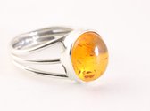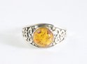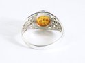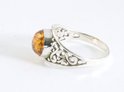 Bague en argent fin faite à la main et magnifiquement ajourée avec une belle pierre d'ambre taillée en cabochon. La teneur en argent est de 925. La bague est disponible en taille de bague 19.