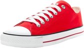 Chaussure en toile classique avec semelle en caoutchouc blanc, finie avec des lignes de couleur. Œillets d'aération sur le côté, embout et laçage en caoutchouc