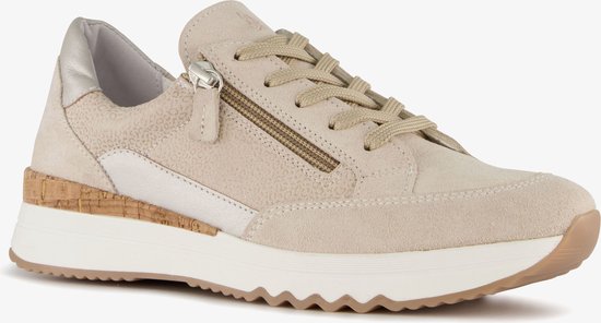 Baskets beiges pour femmes de la marque Hush Puppies. Fabriqué en suède, un intérieur en cuir et une semelle en caoutchouc. Les baskets ont une fermeture éclair et un lacet pour un enfilage facile. La semelle intérieure confortable est en cuir. Celui-ci est amovible.