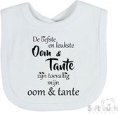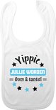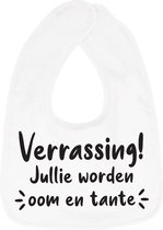 Bavoir Bébé garçon et fille de couleur blanche avec imprimé bleu. Le texte sur le bavoir dit : Youpi, tu vas être oncle et tante ! Le bavoir est doté d'une fermeture velcro pour que vous puissiez l'enfiler et l'enlever facilement. Ce joyeux chiffon à bave est également amusant à offrir en cadeau pour annoncer une grossesse au futur oncle et à la future tante. Célébrez l'arrivée de bébé avec ce bavoir imprimé amusant. Le bavoir peut être lavé à 60 degrés maximum et passe au sèche-linge. Matière : 100% coton. Merk: Bellatio Decorations.
