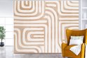 Gebogen lijnen in lichtbruin vormen een abstract doolhof met afgeronde hoeken. De herhaling en eenvoud geven het geheel een natuurlijke en handgetekende uitstraling..