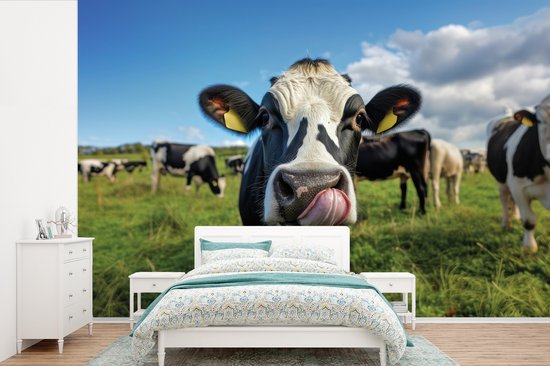Een zwart-witte koe steekt haar kop speels naar voren en likt haar neus, terwijl haar oren met gele oormerken nieuwsgierig gespitst zijn. Op de achtergrond grazen andere koeien in een groene wei onder een blauwe lucht met zachte wolken. De levendige expressie en het landelijke decor stralen een typisch boerensfeer uit..