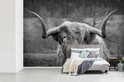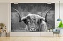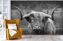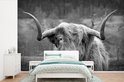 Fotobehang - Schotse hooglander kijkt recht in camera - zwart wit - Woonkamer - Slaapkamer - Kinderkamer