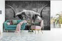 Behang - Fotobehang Schotse hooglander kijkt recht in camera - zwart wit - Breedte 360 cm x hoogte 240 cm