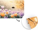 Een dikke, harige bij vliegt boven een veld met paarse, oranje en witte bloemen. De zachte achtergrond en het gouden zonlicht maken de scène rustgevend en natuurlijk..