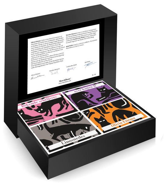Bekende schrijvers over Katten Serie II - Unieke handgemaakte uitgave verpakt in een luxe geschenkdoos van MatchBoox - Kunstboeken Aan de hand van een grote collage van Olivia Ettema koos Bob Polak veertig citaten over katten uit het werk van Nederlandstalige schrijvers en dichters. Nog meer poezen, nog meer pennen — een tweede literair kattenfeest vol humor, wijsheid en elegantie.