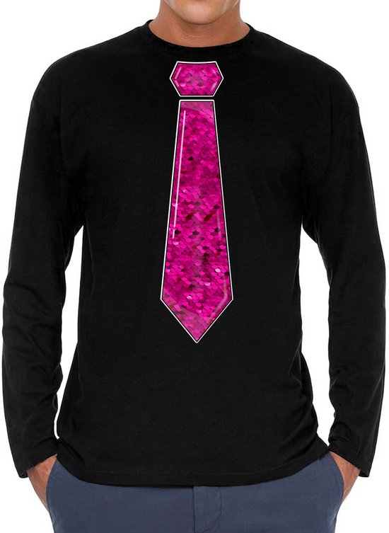 Chemise habillée à manches longues pour homme en noir. Cette jolie chemise est imprimée d'une cravate rose à paillettes. Vous organisez bientôt une mauvaise party ou un carnaval ? Alors cette chemise est indispensable ! La chemise est également agréable à offrir ou à porter lors d'une sortie. Matériel: 145 grammes, 100% coton. Merk: Bellatio Decorations.