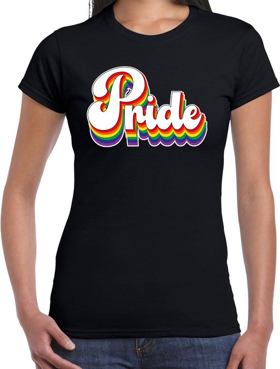 T-shirt Gay Pride pour femme en noir. La chemise porte le texte : Pride, en lettres élégantes aux couleurs de l'arc-en-ciel. Portez cette chemise, par exemple, à la Gay Pride, lors du défilé des bateaux de la fierté sur les canaux d'Amsterdam ou à un autre événement LGBTI/LGBTIQ. Matière : 145 grammes, 100 % coton. Merk: Bellatio Decorations.