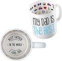 Tasse à café/thé cadeau pour papa en bleu avec un intérieur joliment décoré qui donne à la tasse un aspect cool et ludique. Cette jolie tasse est imprimée avec le texte : My DAD is the Best. Si l'anniversaire de votre père approche bientôt, offrez cette jolie tasse à café/thé, par exemple remplie de chocolats ou d'autre chose de savoureux. Le cadeau idéal pour l'anniversaire de votre père, la Vaderdag ou juste comme ça. La tasse est en céramique et passe donc au micro-ondes et au lave-vaisselle. Les dimensions de la tasse sont d'environ 8 x 9,5 cm et la contenance est d'environ 300 ml.
