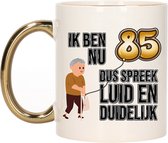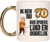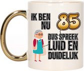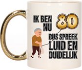 Surprenez quelqu'un qui peut souffler 80 bougies avec ce mug cadeau d'anniversaire humoristique ! Avec une impression d'une grand-mère avec une canne et le texte "J'ai 80 ans maintenant, alors parle fort et clair" dans une couleur marron chaude et avec une luxueuse poignée dorée, cette tasse est un cadeau parfait pour l'anniversaire d'un garçon ou d'une fille avec un bonne dose d’autodérision. Si vous avez dans votre cercle d'amis ou dans votre famille quelqu'un qui aura bientôt 80 ans, offrez cette tasse amusante en cadeau, remplissez-la de chocolat ou d'autre chose de savoureux ! Rendez le 80e anniversaire de quelqu'un spécial avec cette tasse originale qui fait sourire à chaque gorgée ! La tasse est en céramique et passe donc au micro-ondes et au lave-vaisselle. Contenu : environ 300 ml. Hauteur : environ 9,5 cm. Diamètre : environ 8 cm. Merk: Bellatio Decorations.