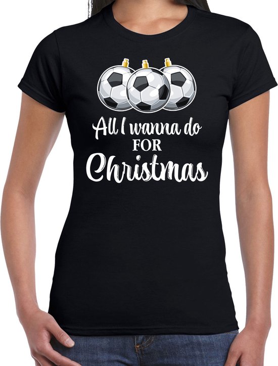 Bellatio Decorations Error Noël T-shirt de football de Noël pour femme, noir. Cette chemise contient des ballons de football avec le texte : Tout ce que je veux faire pour Noël. Perfect pour les passionnés de football.