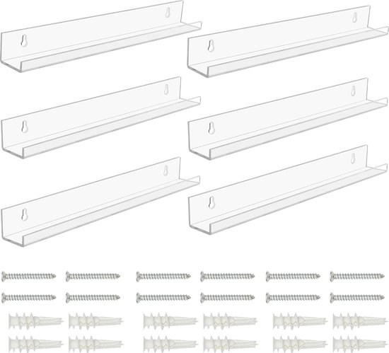 - Lot de 6 : cet ensemble comprend 6 étagères murales transparentes. Chaque étagère mesure L37,8 x L4,9 x H4 cm. Ils sont livrés avec des vis d'installation de 2,5 cm et des chevilles de 2,9 cm. Nos étagères sont fabriquées en plastique acrylique de haute qualité, durable et durable. Ils peuvent supporter jusqu'à 5 livres et ont une conception en forme de U avec un rebord pour empêcher vos articles de tomber.