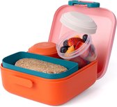 Heel belle boîte à lunch. Design moderne et belles couleurs. Même avec la disposition fixe, il y a suffisamment de place pour les sandwichs et autres collations pour remplir le ventre de tout le monde ! Le bol rond séparé permet de conserver les fruits frais longtemps. Je n'ai pas encore utilisé d'aliments chauds, donc je ne peux pas encore donner d'avis à ce sujet. L'emballage a également été bien pensé : boîte en carton robuste avec un couvercle qui annonce joliment le contenu !