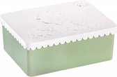 Adorable et pratique lunch box allongée de chez Blafre. La lunch box vert foncé a un couvercle rose pêche avec un cerf et des animaux de la forêt en relief et 1 compartiment. 14,5 x 11 cm. La boîte à lunch peut être utilisée pour les collations mais aussi pour plusieurs sandwichs et fruits. La Lunchbox est fabriquée en plastique robuste et ne contient ni BPA ni phtalates et convient donc parfaitement à un usage quotidien. Parce que le couvercle est en plastique souple, les enfants peuvent facilement l'ouvrir et le fermer. Blafre propose différentes formes de boîtes à lunch et de collations dans des couleurs tendance et élégantes.