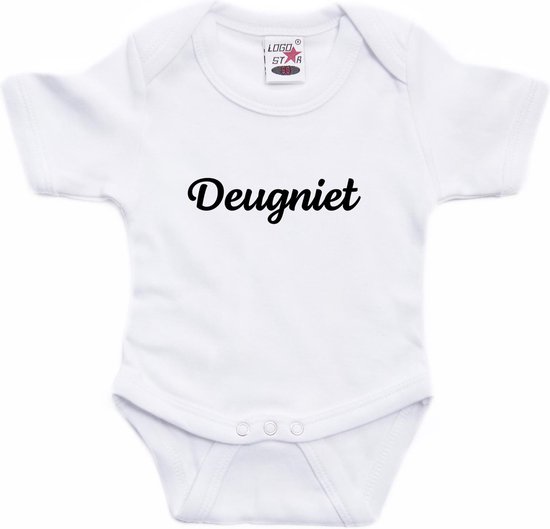 Barboteuse bébé texte cadeau Rogue blanc pour garçons et filles. Cette barboteuse blanche a le texte : Deugniet. La barboteuse est agréable à offrir, par exemple comme cadeau de maternité, ou à porter avec votre tout-petit comme outfit pour la visite de maternité, un anniversaire ou toute autre occasion. Cette barboteuse cadeau a 3 boutons-pression sans nickel sur le fond. Matériel: 240 grammes, 100% coton.