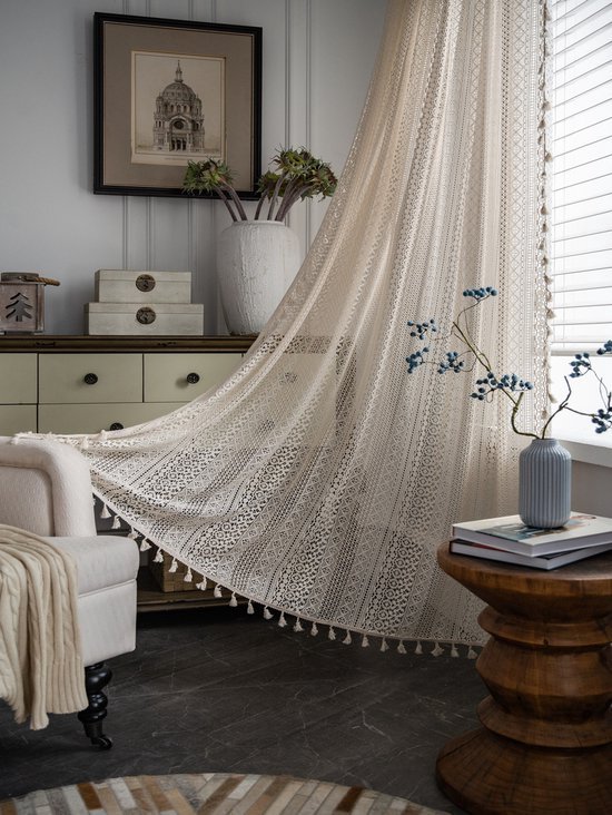 Boho Rideaux Crochets kanten Patchwork Semi-Occultant Bohème Glands Faits À La Main, Passe-Tige Fenêtre Traitement Vintage Rustique Ferme Rideaux Pour Salon Chambre, 1 Panneau 59"wx 86"l,150cmX220cm, Beige