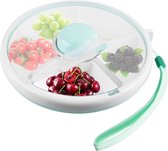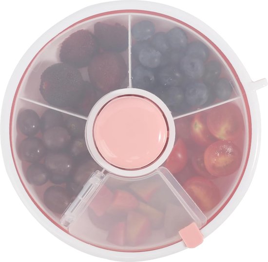 Goodivery ® Cette boîte à collation rotative pratique est spécialement conçue pour les enfants et offre une solution pratique pour emporter des collations avec eux. Fabriquée en plastique non toxique de haute qualité, cette boîte à collation est sûre et facile à utiliser. Sa construction robuste le rend résistant aux chocs et idéal pour un usage quotidien. La boîte à collation comporte cinq compartiments séparés avec un couvercle transparent, ce qui permet de voir facilement ce qu'il y a à l'intérieur et de saisir rapidement la collation que vous souhaitez. Le couvercle est conçu pour empêcher la poussière et l'humidité de pénétrer, gardant ainsi le contenu frais et propre. Grâce à sa taille compacte et à son poids léger, cette boîte à collation est facile à emporter avec vous, que vous alliez à l'école, au parc ou à un pique-nique. La bonne étanchéité garantit qu'il n'y a pas de fuites, même si vous le mettez dans votre sac. La fonction rotative pratique permet de changer facilement de compartiment sans ouvrir tout le couvercle en appuyant sur le bouton du milieu. Cette boîte à collation polyvalente convient à une large gamme de collations telles que des fruits, des chips, des cornflakes et des salades. Idéal également pour les fêtes telles que les anniversaires, Noël, les goûters ou autres rassemblements. Rendez l'heure du goûter plus amusante et organisée avec cette boîte à collation adaptée aux enfants.