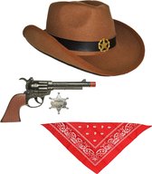 Carnaval Witte habillé d'un chapeau de cow-boy avec un mouchoir à col rouge, une étoile de shérif et un pistolet revolver de cow-boy. Convient aux adultes, femmes et hommes. Le mouchoir de fermier/cowboy rouge peut être utilisé comme écharpe ou bandana et est un article de fête. Le revolver est en plastique.