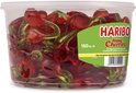 Les cerises Haribo sont une gomme de fruit douce et sucrée. Le bonbon a le goût et la forme d'une cerise. Emballé dans un silo de 1200 grammes, 150 pièces.