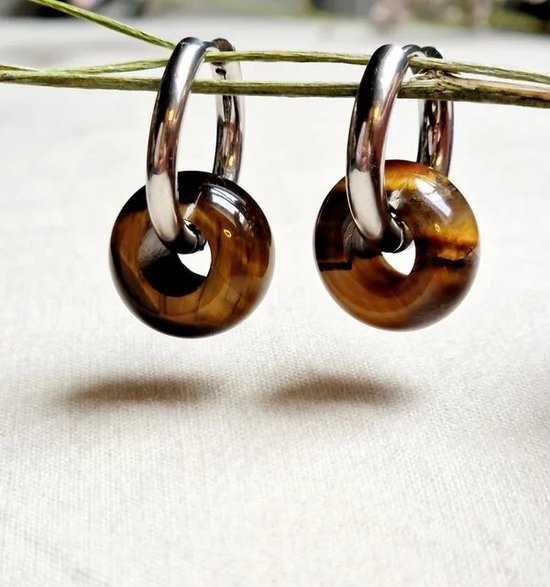 Boucles d'oreilles avec pendentif Donut - Oeil de tigre - Pierre (semi) précieuse brune - Acier inoxydable - Boucles d'oreilles argentées avec pendentif
