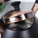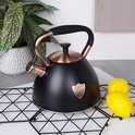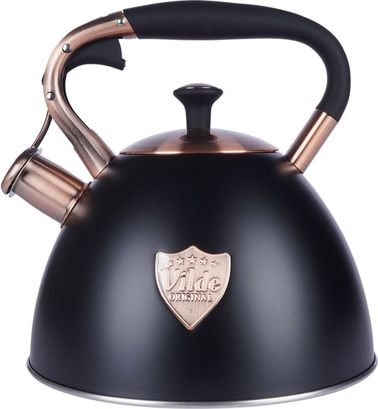 - ACIER - Bouilloire classique en acier inoxydable de haute qualité. Une combinaison spéciale de noir mat avec une couleur cuivre vieilli. L'acier inoxydable est durable et neutre pour l'eau à chauffer, il n'altère pas ses propriétés. Equipé d'un sifflet automatique et d'un couvercle amovible. La bouilloire a une capacité totale de 3 litres et une hauteur de 23,5 cm, la capacité utile est de 2,5 litres.