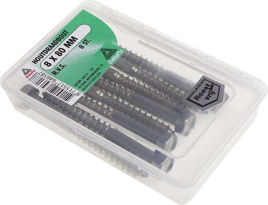 Tirefonds en acier inoxydable à tête hexagonale. Ces boulons sont très solides et peuvent supporter de lourdes charges. Cela les rend très adaptés pour suspendre une chaudière ou un radiateur de chauffage central, par exemple. Vous utilisez également des tire-fonds pour ancrer une poutre dans un sol en béton. Serrez la tête hexagonale avec une clé à fourche ou une clé à anneau.