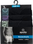 Merk: Apollo Contenu : Lot de 3 Type : Boxer Genre : Homme - Garçons Composition : 80% Katoen 16% Polyamide 4% Elasthanne Caractéristiques : Excellent maintien - Bande élastique Tailles : S- M - L - XL - XXL Couleur : Noir Assorti
