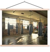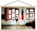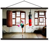 Boxer thaïlandais fait un coup de pied haut dans une affiche d'école de gym lattes plates vierges 150x100 cm - Tirage photo sur affiche textielposter (décoration murale salon / chambre)