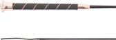 Cravache de dressage avec un noyau en fibre de verre et un bâton noir. Le revêtement spécial assure une légère brillance et une durée de vie plus longue. Le cordon de pliage (10 cm) est également très résistant grâce au revêtement de renfort. Le fouet a un manche en cuir avec des imitations de diamants et un luxueux bouton argenté.