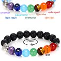 Ce bracelet extensible unique de 19 cm attire tous les regards. La roche volcanique se combine ici avec des pierres précieuses de chakra colorées et une tête de Bouddha argentée, ce qui en fait un complément parfait à toute collection de bijoux.