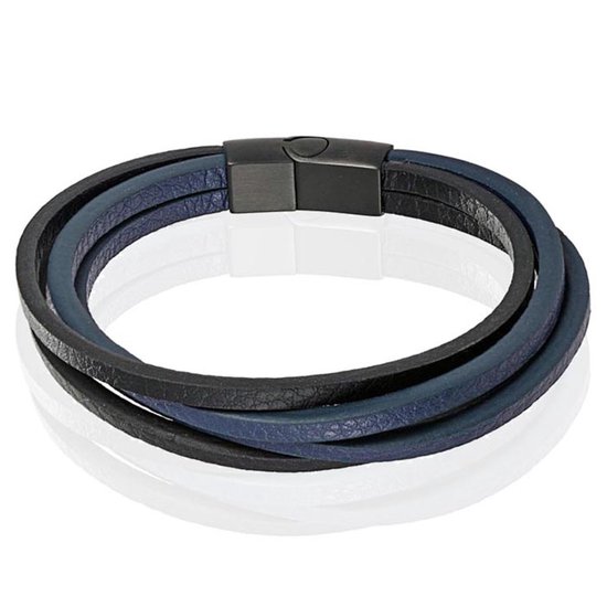 Bracelet en cuir Mendes pour homme en noir et bleu. Le bracelet est composé de quatre sangles en cuir et possède un fermoir magnétique en acier inoxydable. Le bracelet pour homme mesure 16 mm de large et pèse 12 grammes. Le bracelet est livré dans un sac cadeau Mendes.