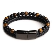 Malinsi Bracelet Homme - Pierre Onyx Marron Cuir Cordons et Acier Inoxydable - Bracelet Homme 20 + 2 cm Extension
